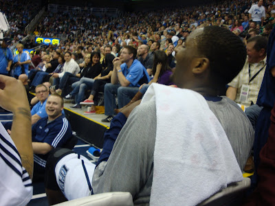 The Jazz were up by a ton because West got ejected early in the game for a #2 Flagant Foul on Korver. Which means D-Will and Boozer took a long break on the bench. They were so funny to listen to. They called Ronnie Price. R.P. and kept yelling at him to shoot it or drive. They were making fun of some of the fans and then They did the Chicken Dance! I was laughing so hard. Deron was like they don't have this in Alaska and CJ was like yeah I learned it here. C.J. said "What do they called it the funky chicken?" " D-Will said no its like The crazy chicken." LOL
